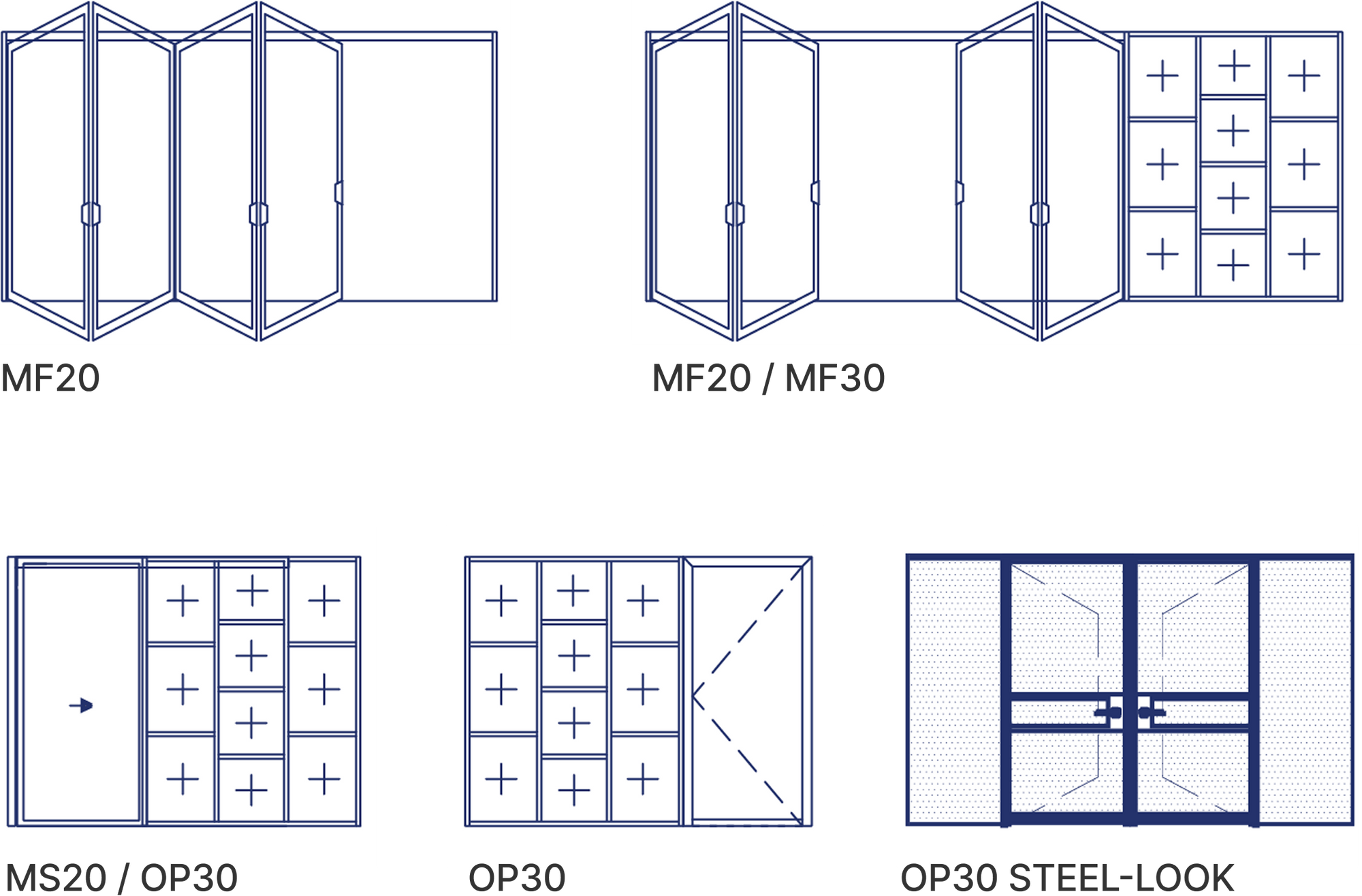The MF20, OP30, MS20, and OP26 systems offer a cohesive range of loft-style demising solutions, including folding doors, partitions, sliding panels, and steel-look doors. Designed for modern offices, they combine industrial aesthetics with flexibility, privacy, and seamless space division.
